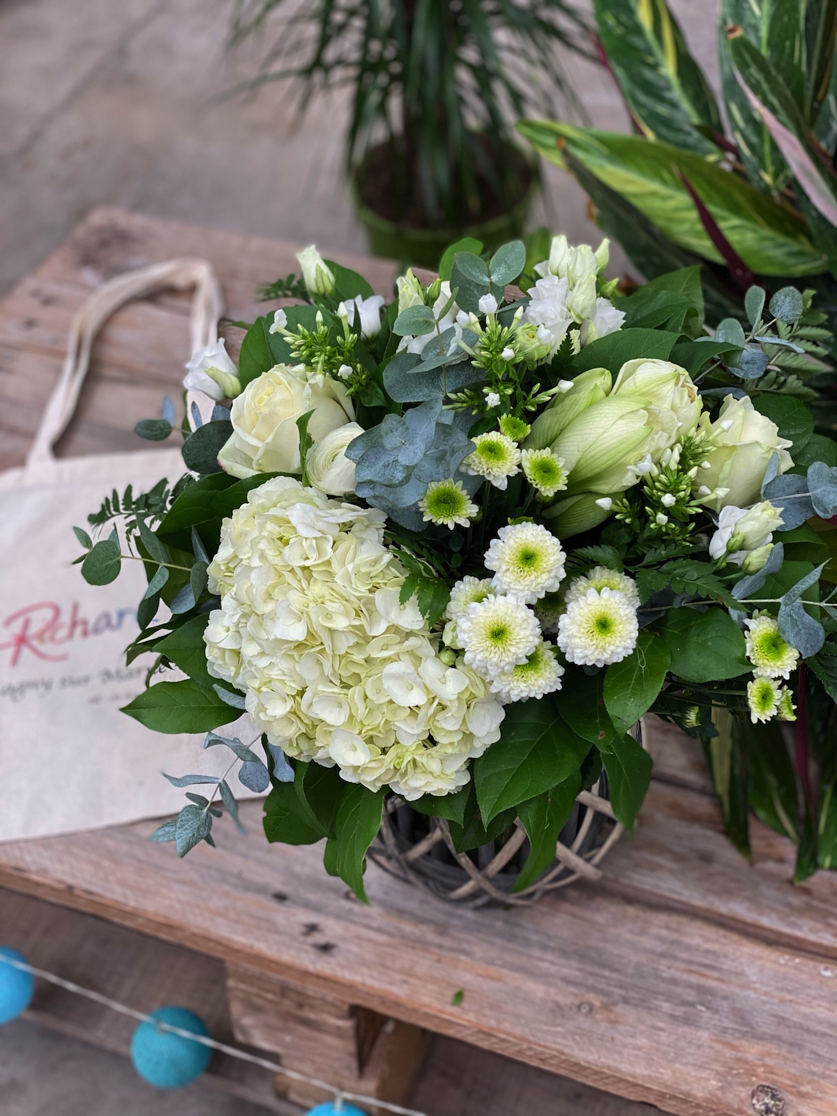 Ce bouquet de fleurs aux couleurs naturelles est inspiré de la douceur d’un bébé, prénommé Paul. Il est proposé dans un camaïeu de blanc et vert avec des fleurs de saison.vCette composition sera réalisée le matin même de votre commande par nos artisans fleuristes avec les fleurs de l’arrivage,